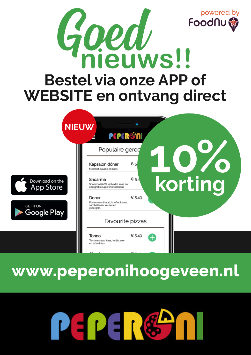 Peperoni is de pizza sensatie voor Hoogeveen e.o. Naast pizza´s zijn wij ook gespecialiseerd in broodjes/salades en pasta's en deze worden uiteraard desgewenst bij u thuis bezorgd. Hiernaast ziet u onze nieuwe folder, u kunt de slide stoppen door met uw muis er op te staan. Bestellen doet u via onze online bestel systeem, gemakkelijk en snel !